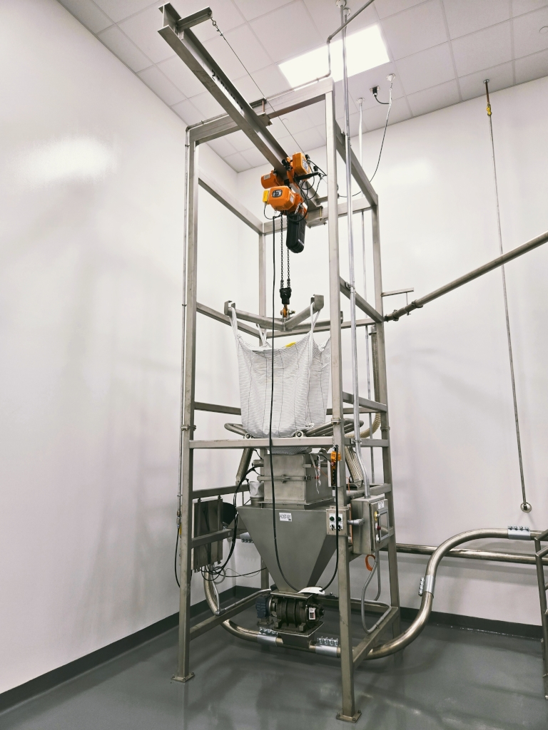 Ingredient Solutions Bulk Bag Unloading Systems provide an efficient means for handling ingredients received in bulk bags. Our Bulk Bag Unloaders are designed for various sized bulk bags, and can be loaded by either fork lift, or powered hoist and trolley. An untie hopper mounted below the bag rest platform allows the untying of bulk bags and discharging ingredients, while maintaining a clean environment. Optional bag massagers provide assistance with the conditioning and discharge of ingredients from bulk bags.