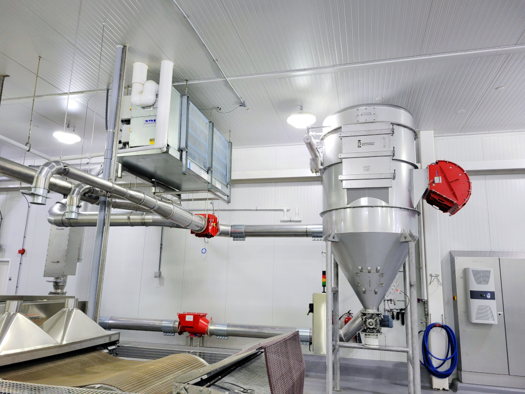 Ingredient Solutions Flour Reclaim Systems allow the collection and reuse of flour used in a customer’s process, providing numerous benefits including reduced ingredient cost, improved dough quality, and reduced downtime associated with required maintenance of freezer coils and oven burners caused by migrant flour dust.